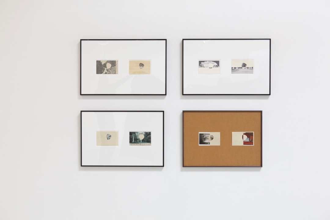 The majority of the works in the exhibition are drawings made by erasing selected portions of record album covers and postcards. In the diptych, loose change, there is the idea of the casing or the wrapping on one hand and the polished jewel or piece of chocolate on the other. Some are idiosyncratic scenes like, The Living Wedge, an erased skeleton balanced between end tables, a reflection of my daily tai chi practice. There’s also a physical scored line in the wall of the gallery, a gesture that echoes not only the grooves in vinyl records but also the process of scoring into a surface to remove the image. The boxed set album pieces, 15–19 frames per second, deal with time and of course film but are essentially about how paralysis can suddenly function as a prompt.